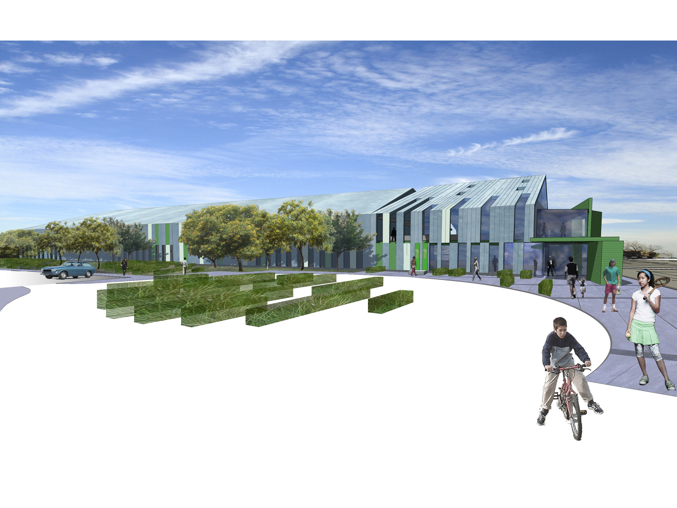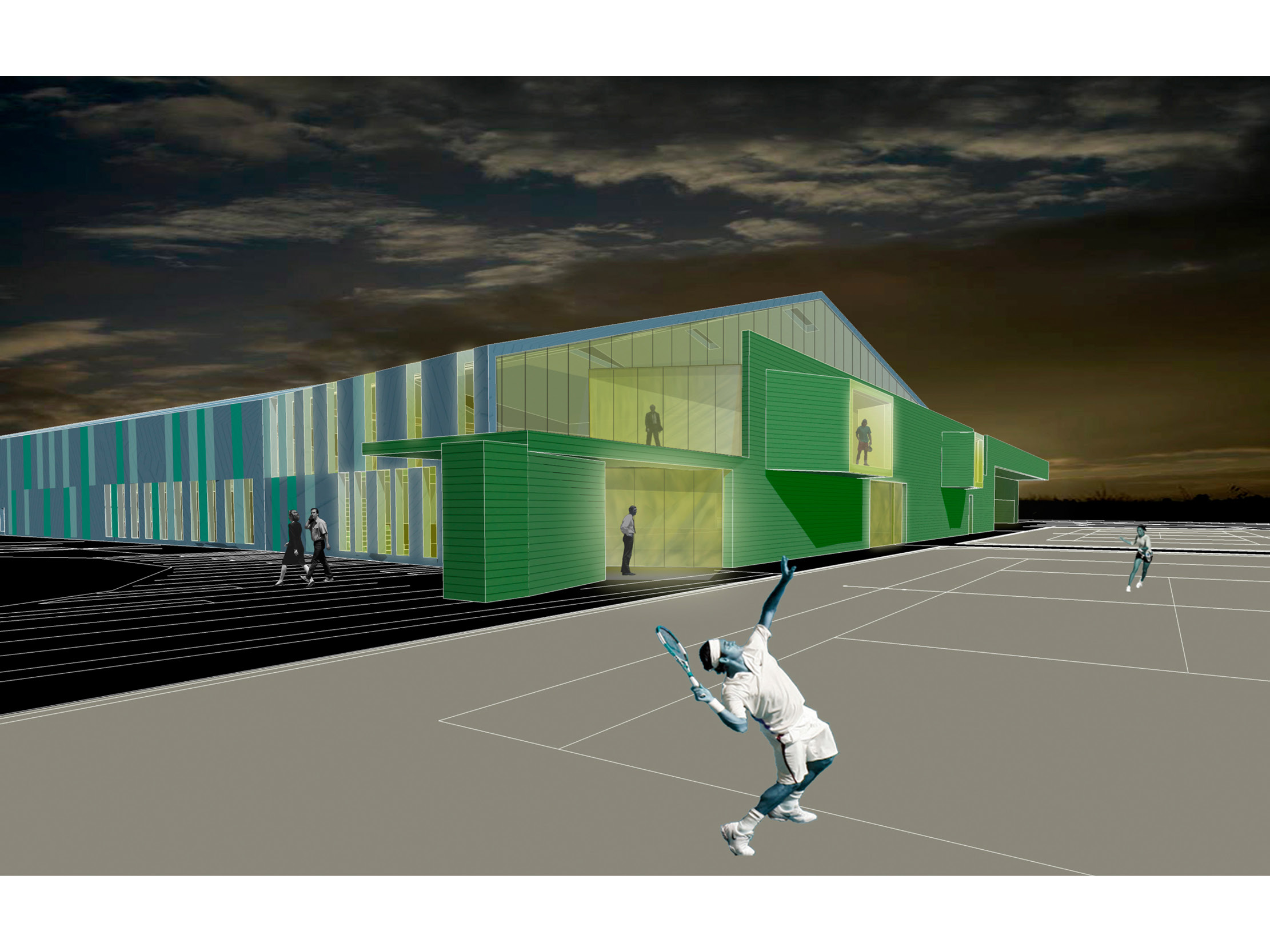 Working within a modest budget, the design strategy employed a six-bay pre-engineered steel structure, clad in green and blue metal panels that give the building a light, vibrant character. The clubhouse, set in the easternmost bay and rotated toward the entrance plaza, houses amenities, classrooms, and fitness areas. This inflection brings natural light into the interior, while the bleacher seating penetrates the metal shell, extending into the mezzanine plane.