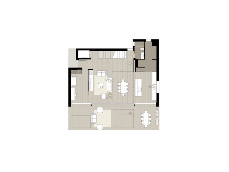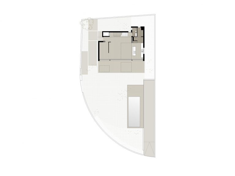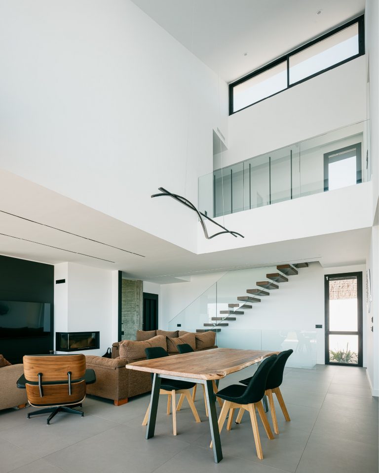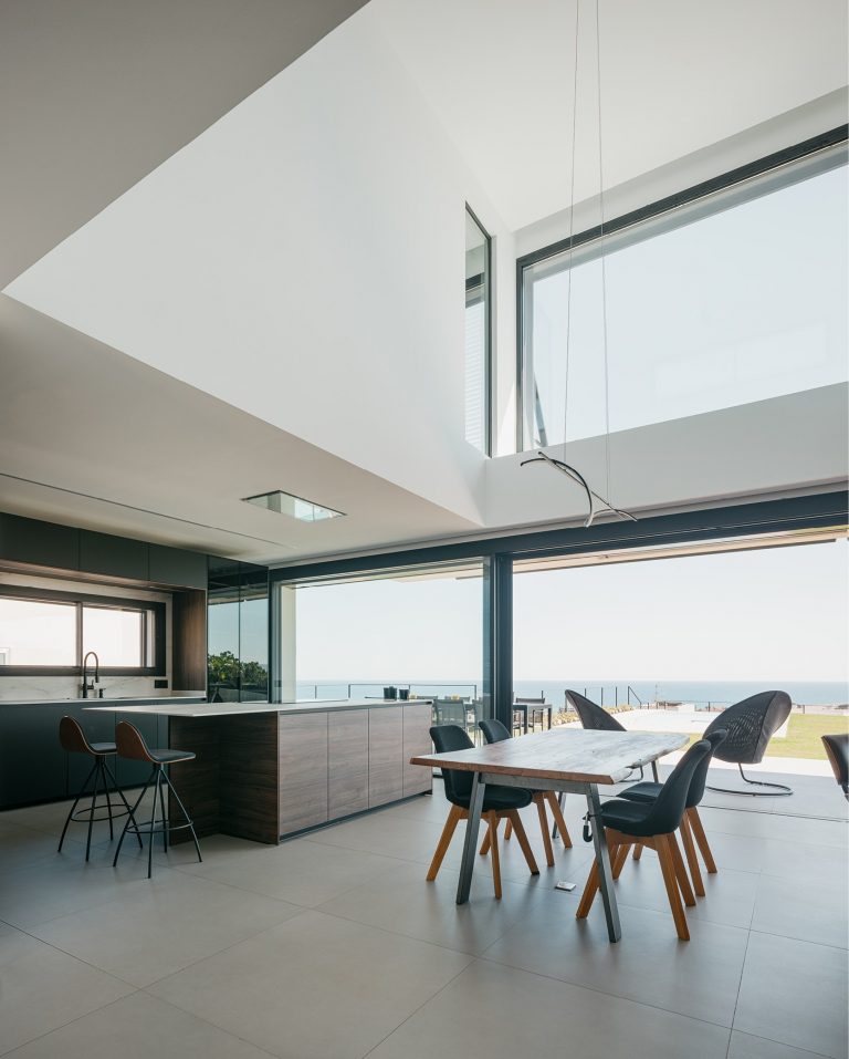 L’organització interior s’estructura en dues franges. Al sud, la zona de dia s’obre completament al mar: sala, cuina i menjador s’encadenen en un únic espai, on la doble alçada del menjador permet l’entrada de llum zenital i reforça la continuïtat amb el cel. Al nord, parcialment encaixat al terreny, se situen els espais de circulació, serveis i l’escala, que connecta els diferents nivells de la casa.