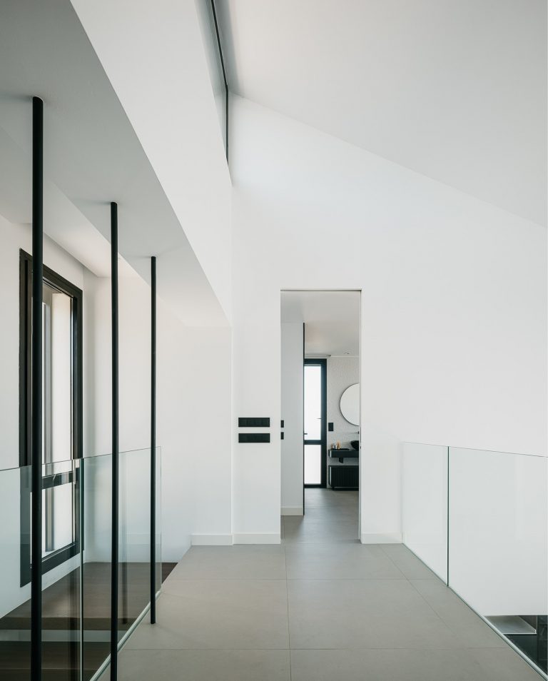 El projecte planteja una estratègia contundent: diluir els límits entre interior i exterior. El gran porxo-mirador, de 14 metres d’amplada i suspès amb tirants metàl·lics sense pilars intermedis, es converteix en el cor de la casa. Un espai de trobada, lluminós i protector, que connecta la vida familiar amb el jardí i el paisatge.